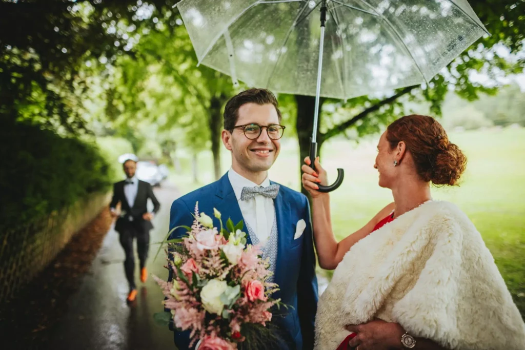 Entscheidend ist, dass du dich bereits vorab auch auf einen Regentag einstellst. Eine Hochzeit mit Regen kann sehr romantisch sein und gerade bei den Fotos als besonderes Ereignis inszeniert werden. Momente der Zweisamkeit lassen sich sehr gut abbilden, vor allem, wenn du einen stilvollen Schirm gezielt einsetzt.